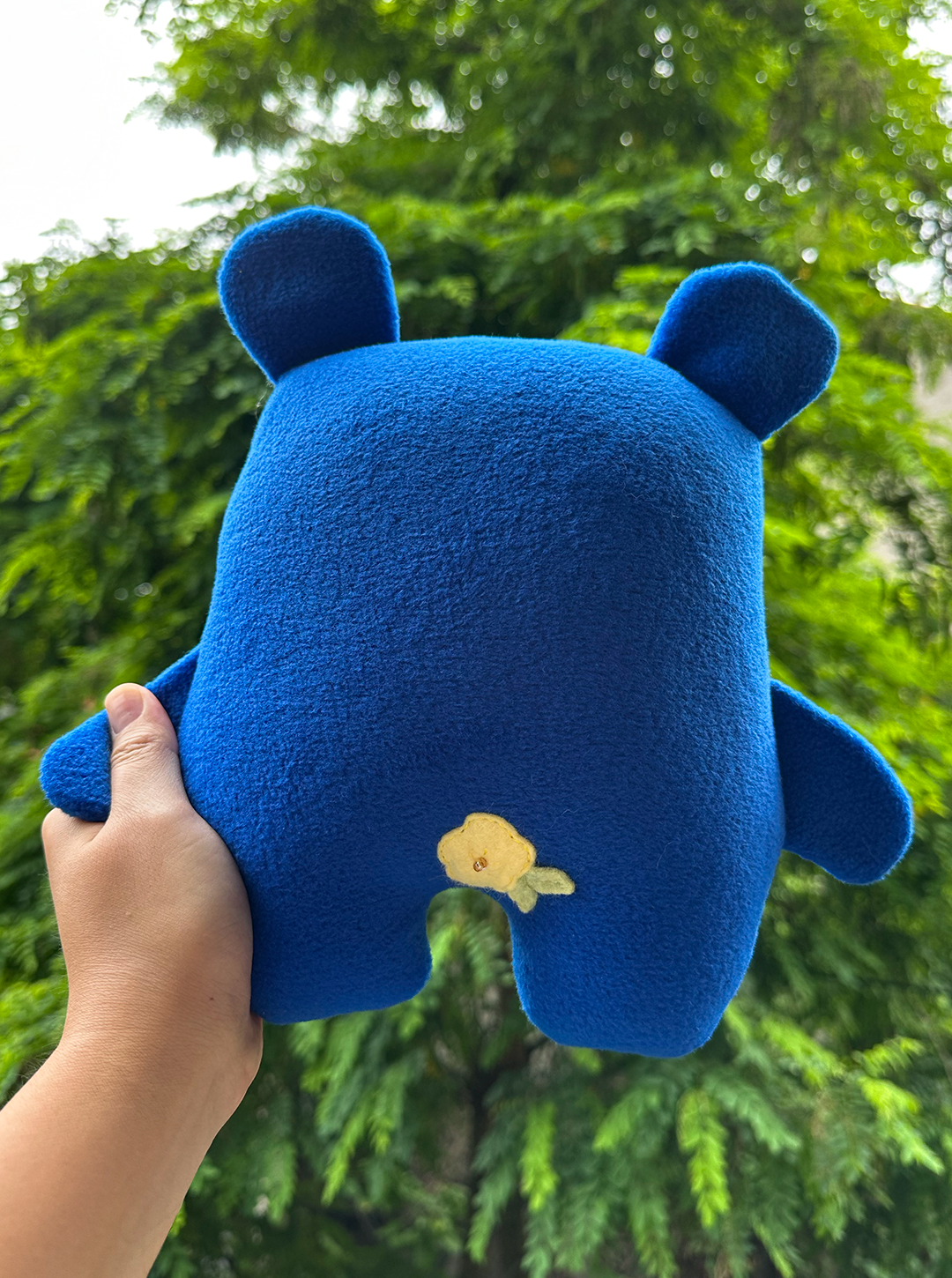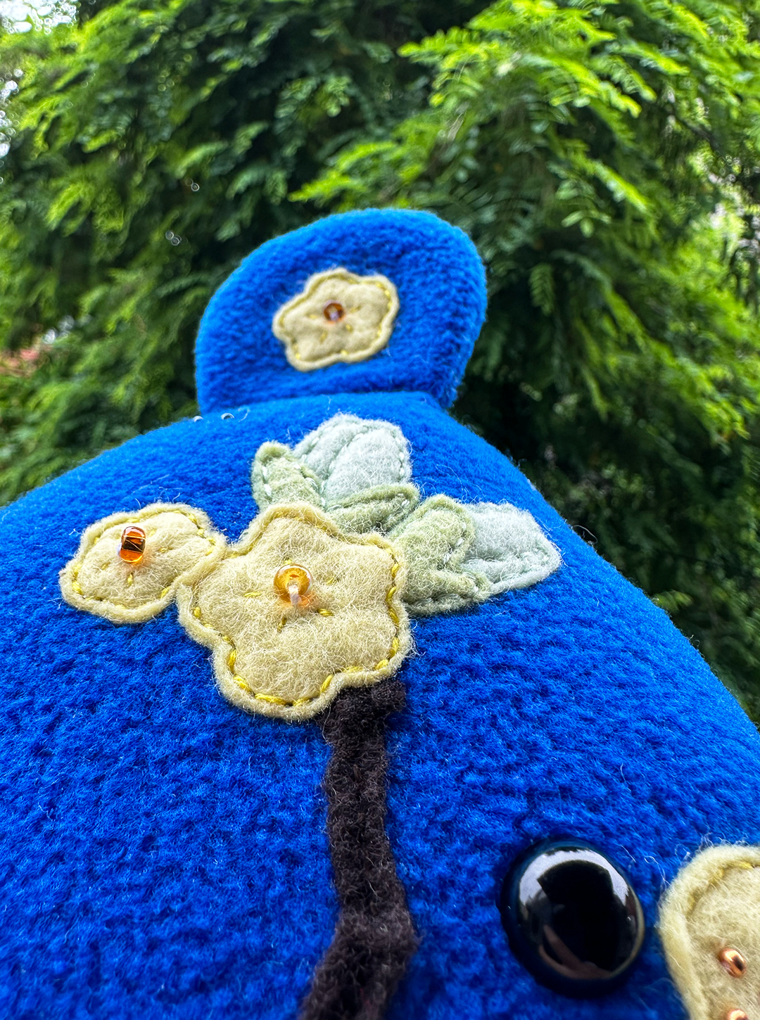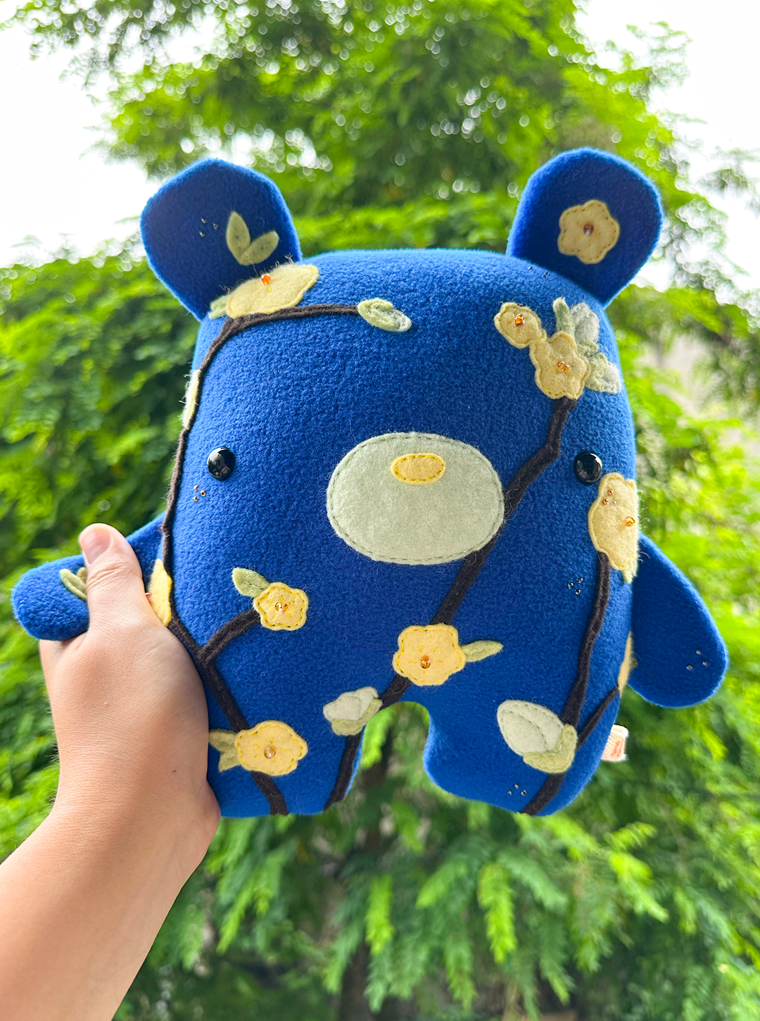 Navy blue bear plush with hand sewn blossom and flower bud details.